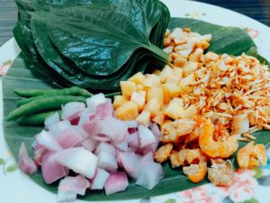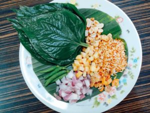 Miang Kham consisted of Bai Chaplu (Wildbetal Leaves or Piper sarmentosum leaves) , Roasted coconut ( chopped in the small pieces) , Chopped Bird Chilli paper , Chopped shallot ,Chopped ginger , Chopped Lime ( Small pieces) , Unsalted peanuts or cashew nuts and small dried shrimps.