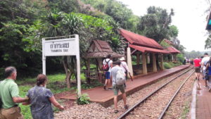 From the main street called “ Saeng Chuto Rd.,” you could find the train station which you could get on the local train and tracing the railroad on the Death Railroad. There would be 2 different trips for the train. One train you could catch and start the trip from Bangkok, however it would leave Bangkok very early. We do suggest the second choice by taking the train from Kanchanaburi train station which would take only an hour for the ride. You could enjoy and see the famous Death Railroad until get off at Tham Krasae Station. The train leads you through the local area by passing the small villages, passing the River Kwae Bridge ( 2rd War World Bridge from iron over the River Kwae) and finally before reaching Krasae Station, you could find the railroad goes slowly against with the cliff where you could see the depth from the train window. This is the highlight for you to take photos. The train would stop by Krasae Station for us to get off and then continue on its way. After get off the train, you could also walking on the death railroad for taking the pictures as well as visit Tham Krasae ( Krasae cave) near by the railroad where once during the 2nd World War used to be the shelter for the captive at that time.