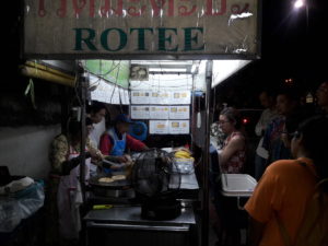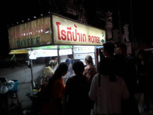 The Rotee stand of Aunty Day  starts from 7pm. If you walk along Thapae Rd.. Before reaching Thapae Soi 4 , in front of Mahawan Temple, you could find aunty with her husband there. No matter there are many  orders from people who waiting for the tasty Rotee or how busy she is. One thing you could find from her face is a lovely smile for all customers.   This would show us that Aunty Day is happy and loves making Rotee for everyone. It is also making people happy when they see her smile when she cooks as well. If you have a chance to visit Chiang Mai. After having dinner or if you are strolling along Thapae Rd. back to the old town, you could stop by and buy some tasty rotee as you could order from the sign. Fresh cook rotee , nice smell and tasty is waiting for you there at “Aunty Day’s Rotee”