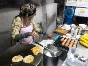 “Rotee” becomes one of the snack for the people and easy to find almost every where. In Chiang Mai since we were young , we had seen this Rotee stand for many years. We always see many people waiting for the rotee form ” Aunty Day”. She had sold Rotee for long time. Located on the main street called ” Thapae road”  on the east side of Chiang Mai old city wall. We always stop by for the delicious Rotee and now we found that there are many different flavor which you could order from the menus that hang on the roof of the stand on wheels. The price of the rotee starts from 6THB  up to 45THB depending on which flavor you would order.