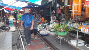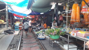 “Ta-lard” means market, “Rom” means Umbrella or the shade which comes from the tents that the local vendors used to give them the shade and hiding from the heat of the sun while selling their things in the market. “ Hoop “ is the verb means to close. No wonder, you could see all vendors close their umbrellas when the train passes by.