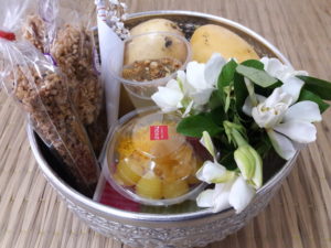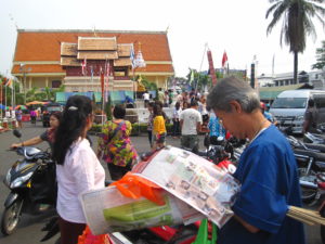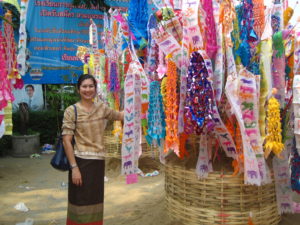 After the 15th April of every year, it is the new year for the Northern Thai people. We would prefer for the stuffs which we had prepared for. Mostly “Pha Tong” ( The common word used to call “The Pha Khao Ma” = The cotton cloth checked in colorful design use as the towel , turban , shorts or even belt!) , “Pha Sin” ( The local word for the Sarong mostly wear by the ladies in colorful design.) , “The Suea Kom” , the local cotton bra with the small pocket to keep the money in. Mainly the old ladies love them to avoid losing the things , they would keep in the pocket. The Pee Mia Muang present that offer to the elderly could be something else : Food , Snack and other. However the must that we bring together with the present would be the Khoa Tok ( Rice Popcorn) , Paper candles , Scented water and flowers (Mostly use the jasmine due to the scent of the jasmine is nice and the good meaning of purity mind.).