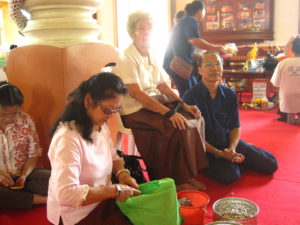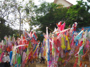 This day’s also the day we prepare cutting the ” Toong /Tung”, the northern Thai Flag. There comes in many shape and forms. ( Nice cutting in beautiful layers or printing). Our family preferred making the flag ( Toong) in the shape of the Dhava and Angel. Mom and Dad always told us about heaven and hell to keep us as a good people. They told us that this’s a good and perfect of the occasion for us to send the Dhava or the Angels to help our ancestors or some other spirits who suffering in the hell to go up to the higher level or even the heaven if they were good. This’s one way to safe them and for us to making merit which I do remember and still follow mt family tradition until now. ( You could find the pictures of the Dhava and Angels Toong in our Facebook page : Chiang Mai Tour Center). You could also create one by your own as well. It’s not about art , but it connect to the ritual as well. On the 14th April, we could also prepare the sand for the offering back to the temple as well. In the old days , the temples’ ground were only dirt and sand. When people wen to the temples, we usually walked and stepped on the dirt and sand out from the temples. This’s the way we could return the sand back to the temples .So they could use them for all constructions in buildings and others as they need. However just the pile of sand , it wouldn’t look nice for the temples. People try making the pile of sand into the sand pagodas and also use the Toong ( Long Flag) for decorated in the same time.